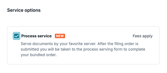 If your state supports File-Serve-File, any eFiled case initiation you start in InfoTrack will include the option to add process serving to your filing order. This section will appear immediately after you have designated a payment option for your eFiling.